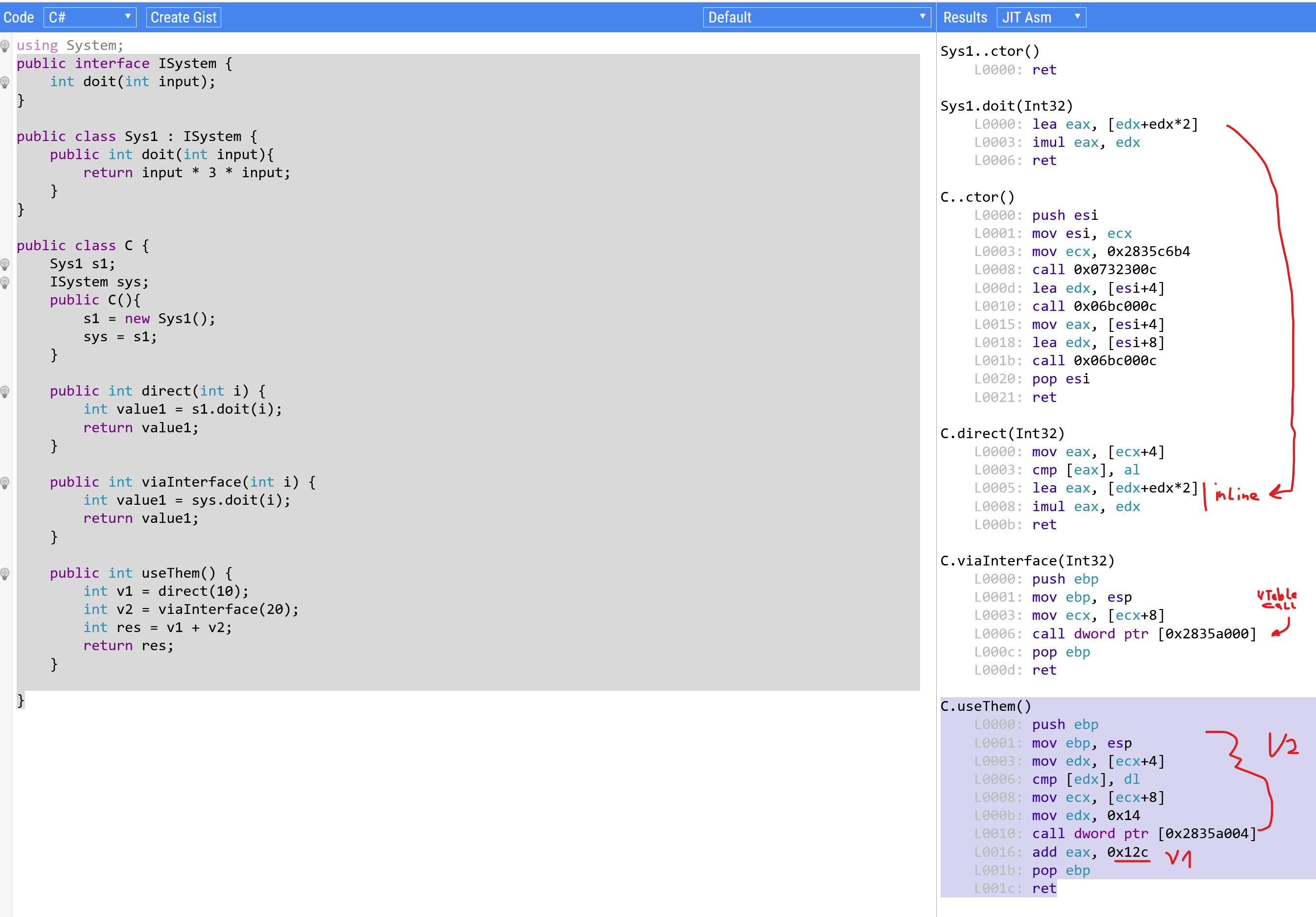 because it knows exactly which method is being called. In fact, in release mode, the JIT often eliminates the call entirely by embedding the calculation directly. (Note: only simple methods that meet certain criteria are automatically inlined.)viaInterface